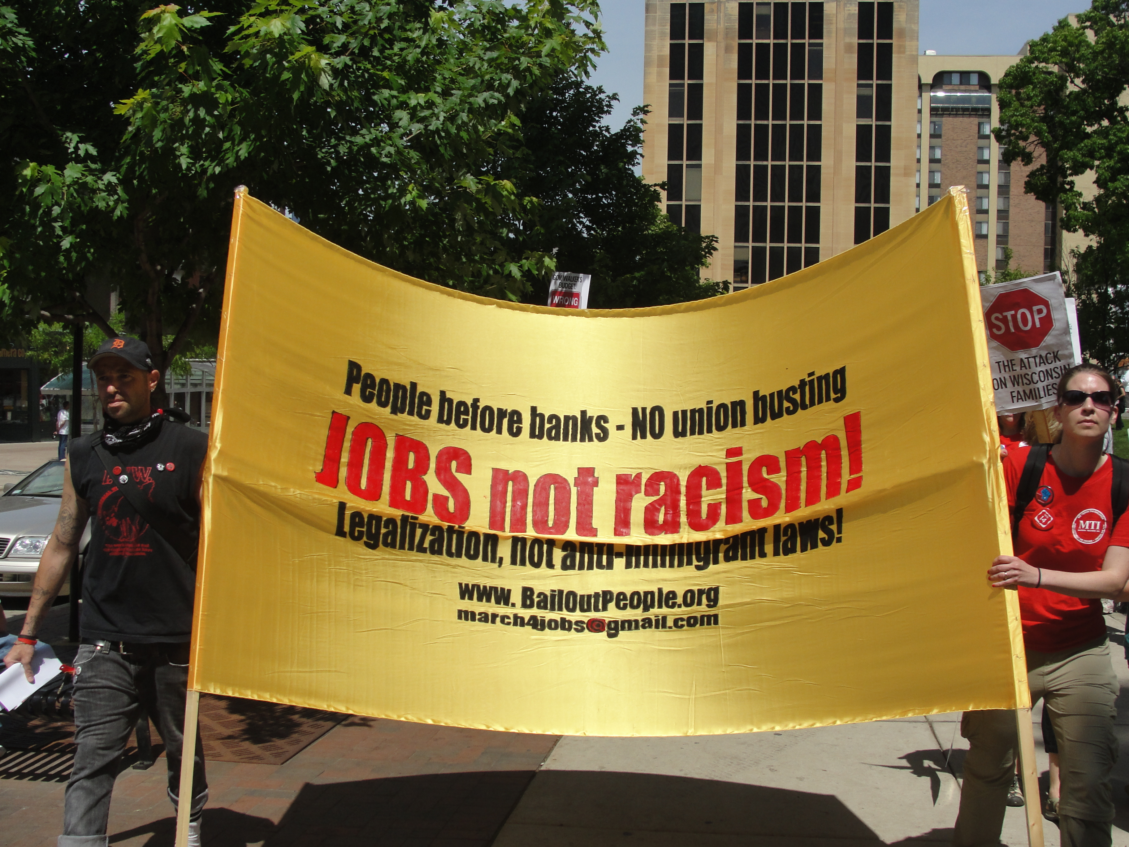 Categories Uncategorized Rally against illegal, racist, anti-union budget June 16 in Madison Post author By wibailoutpeople Post date June 15, 2011 MADISON – THURSDAY, JUNE 16 Rally at the Capitol Thursday, June 16 Noon – Marches begin at Walkerville on Capitol Square 5:30pm – Rally at the Square and State St. http://www.wisaflcio.org/ JOBS Not Racism! No to anti-people budget ### Share this: Click to share on X (Opens in new window) X Click to share on Facebook (Opens in new window) Facebook Like Loading... Related ← Bloombergville in full swing in NYC → Stand Up For Our Children-Protest The Budget Cuts! Milwaukee protest June 16