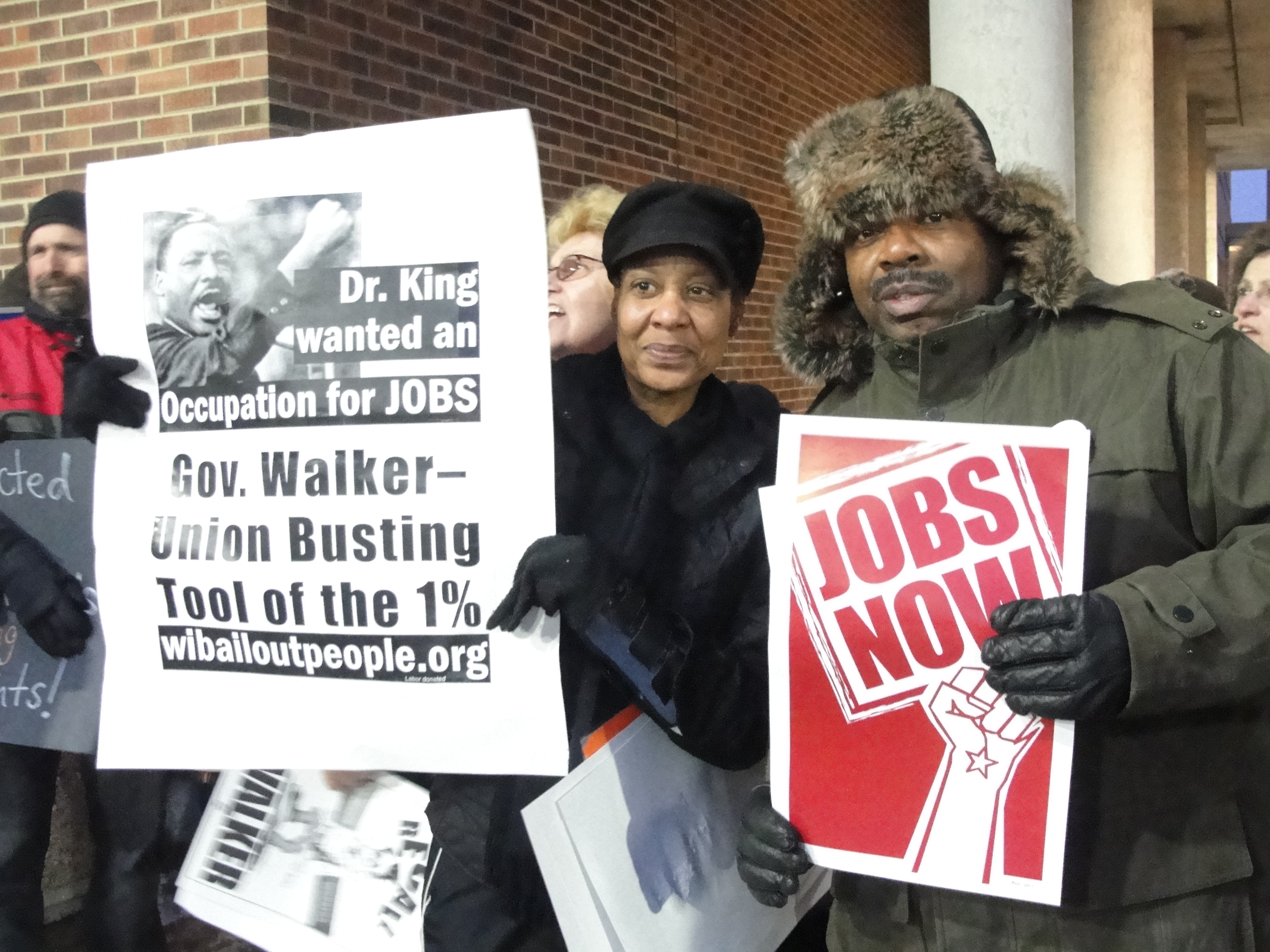 Categories Uncategorized Celebrating 1 Million Recall Walker Signatures at Milwaukee Area Technical College (MATC) Jan. 17 Post author By wibailoutpeople Post date January 17, 2012 http://www.facebook.com/media/set/?set=a.2789306223061.127967.1570502599&type=1 Mr. Gilbert Johnson, president of AFSCME Local 82 (right) celebrates with protester 1-17-2012 at MATC. The crowd at MATC 1-17-2012. ### Share this: Share on X (Opens in new window) X Share on Facebook (Opens in new window) Facebook Like Loading... Related ← One Million Signatures to Recall Walker → Photos: Occupy Wall Street Not Palestine Jan. 17 Milwaukee Forum
