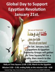 Global Day to support the Egyptian revolution on Jan 21st. 2012 in New York, Washington DC, Boston, Chicago, Dallas, Houston, Vancouver, Toronto, Ottawa, Melbourne, Sydney, Paris, Rome, and other cities continuing to join.