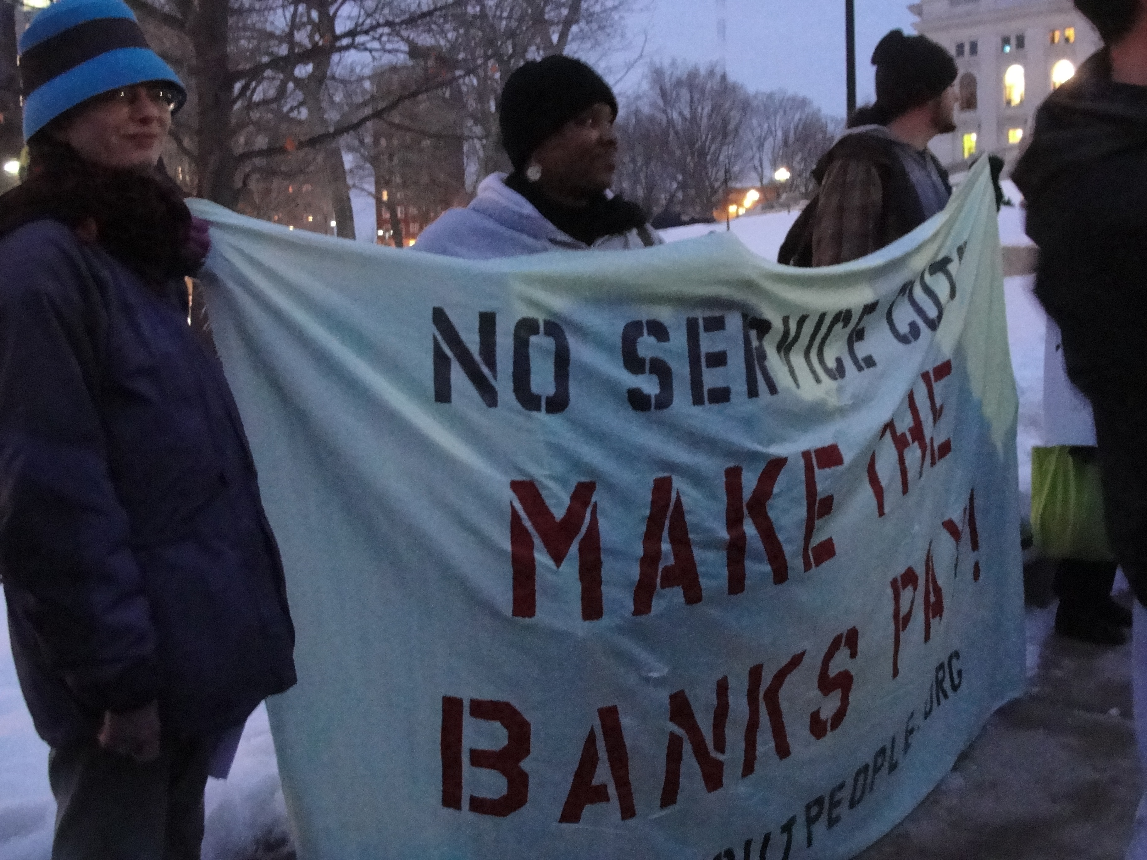 The people standing with Native Nations & opposing Walker's 'state-of-the-state' banker's and corporations 1% speech Jan. 25 at the state capitol in Madison. WI BOPM banner reads: 'No Service Cuts: Make The Banks Pay!'