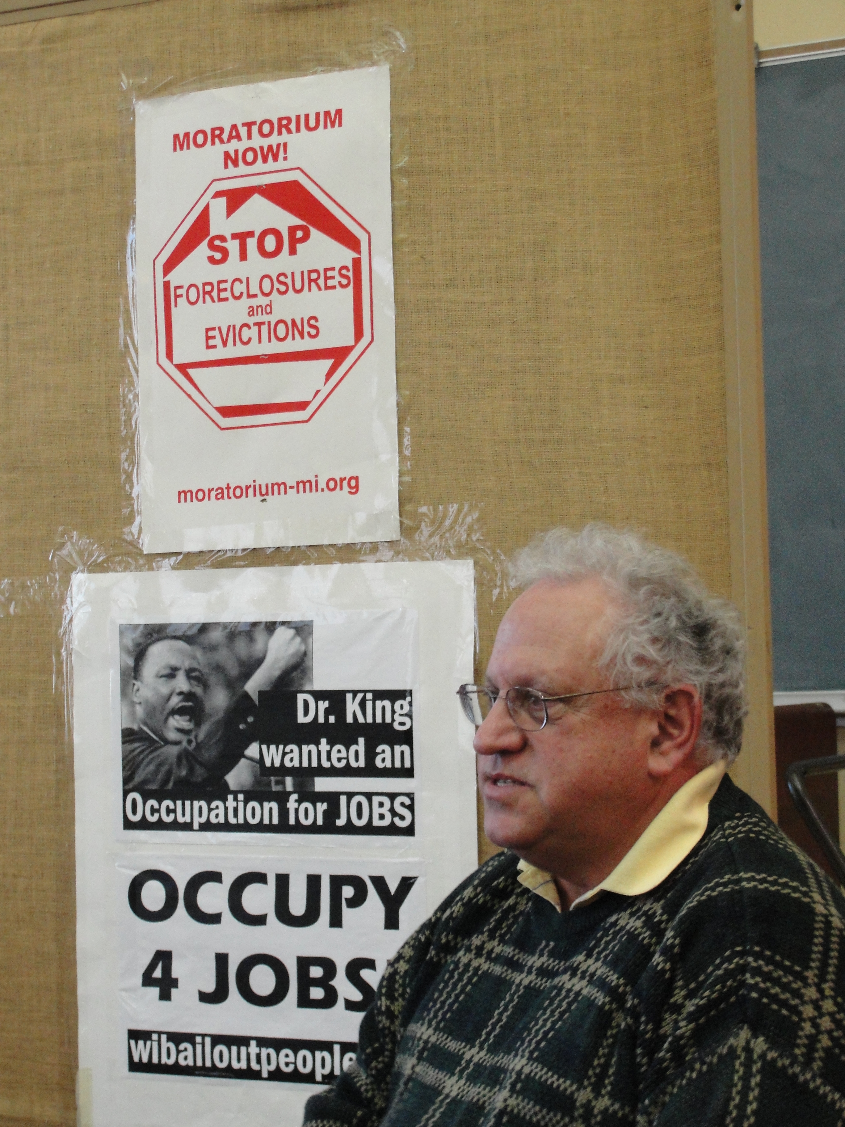 Following this Jerry Goldberg, a people’s attorney and a leader of the Moratorium Now! coalition in Detroit, gave a presentation on how the banks and other capitalist financial institutions are responsible for the foreclosure and eviction epidemic that continues to sweep the United States. In Milwaukee alone there have been over 20,000 foreclosures since 2007, most in African American and Latino/a neighborhoods. Goldberg closed with a call for those present to join the growing movement that is fighting for a moratorium on foreclosures and evictions. He invited everyone to come to Detroit for a March 31 “National Conference For a Moratorium on Foreclosures & Evictions.” http://nationalmoratorium.org/