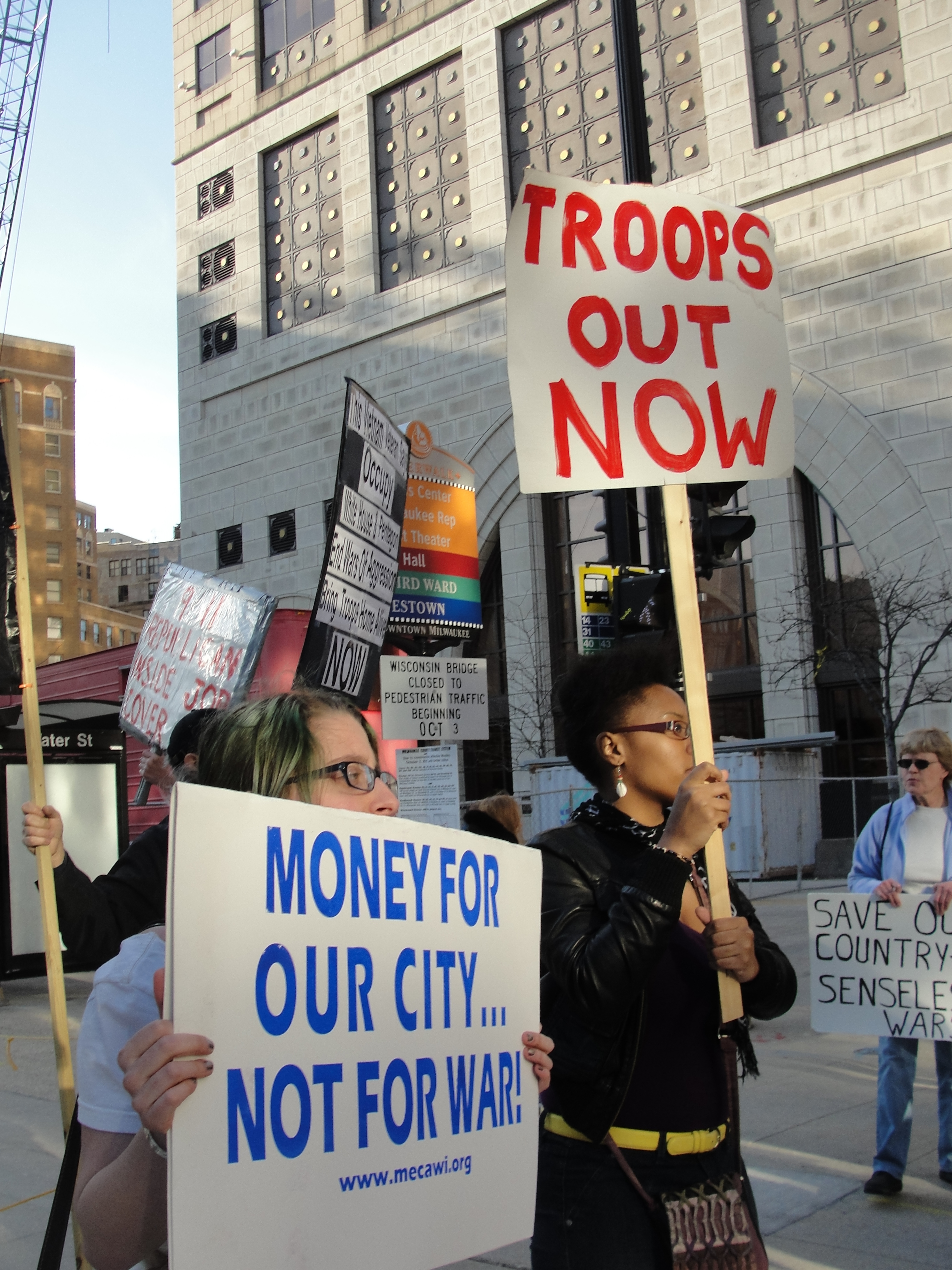 Categories Uncategorized Photos from Chase Bank & U.S. Out of Afghanistan Protest Today in Milwaukee Post author By wibailoutpeople Post date March 13, 2012 http://www.facebook.com/media/set/?set=a.271832159562974.66929.151521811594010&type=3 March 13, 2012 Milwaukee. March 13, 2012. Julie Enslow of Peace Action Wisconsin speaking out against the U.S./NATO war on Afghanistan in downtown Milwaukee March 13, 2012. ### Share this: Click to share on X (Opens in new window) X Click to share on Facebook (Opens in new window) Facebook Like Loading... Related ← March 15, NYC: Protest Brutal Massacre in Afghanistan → URGENT: BadgerCare Protection Act Hearing Today! Send message NOW