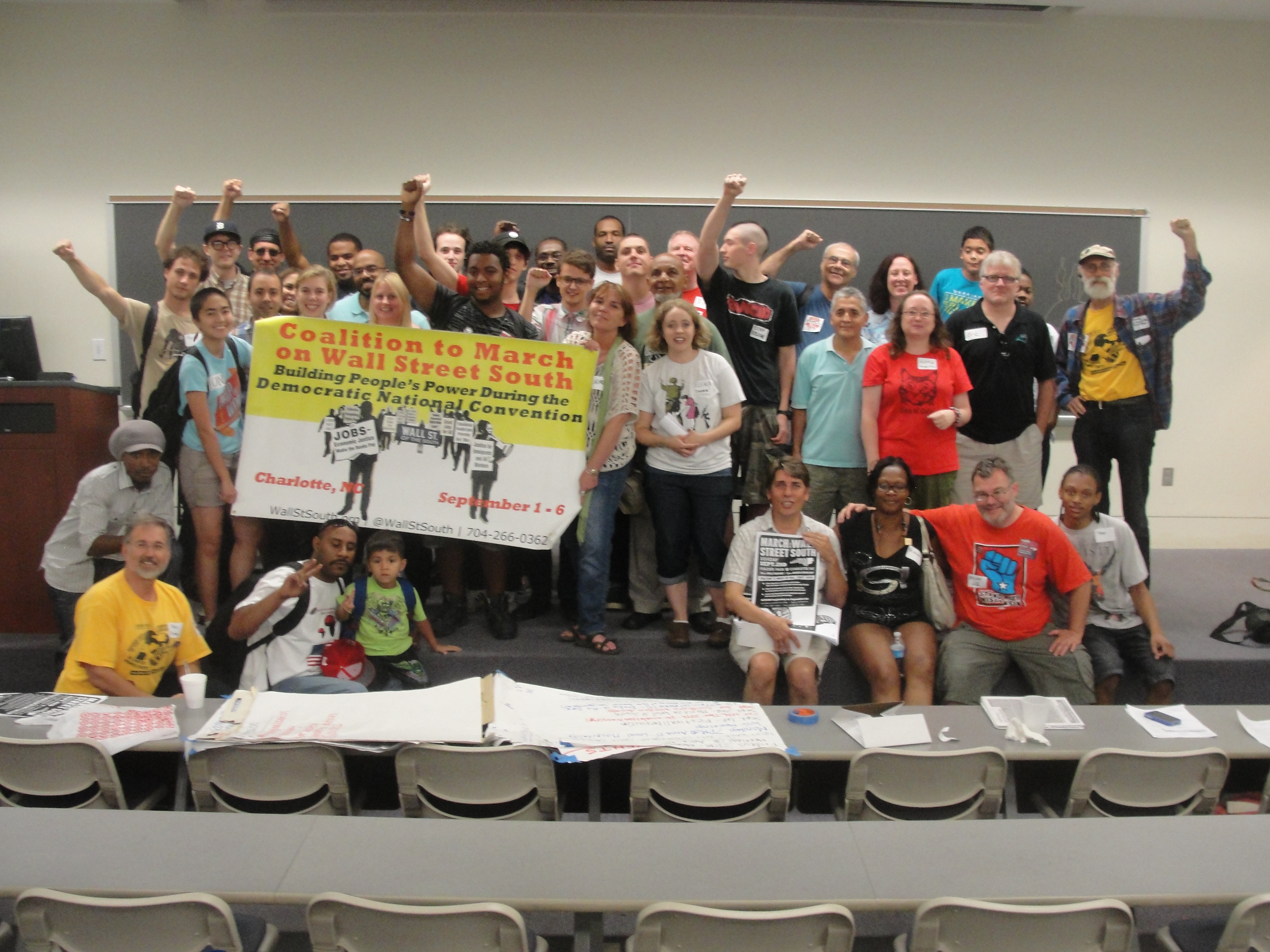 Over the weekend, the Coalition held an organizing conference that was attended by over 60 people from several states. Local Charlotte and NC organizers were joined by activists from Illinois, Wisconsin, New York, and Massachusetts. Many different reports were shared on the progress of the work to build for the mobilization in September. One especially exciting report from the outreach committee highlighted that more than 20 organizing centers — including more than 8 in NC from Asheville to Rocky Mount — have been established across the country to bring people to Charlotte for the March on Wall Street South and the other events being planned by the Coalition.