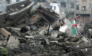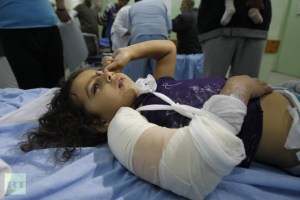 An injured Palestinian child lies on a hospital bed following an Israeli air raid in Beit Lahia, the northern Gaza Strip on November 17, 2012 (AFP Photo / Mohammed Abed).Palestinians inspect the destroyed office building of Hamas Prime Minister Ismail Haniya in Gaza City on November 17, 2012 (AFP Photo / Mahmud Hams).