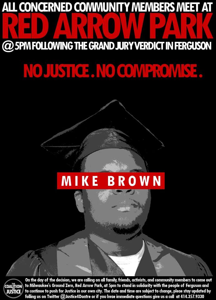 On the day of the decision, we are calling on all family, friends, activists, and community members to come out to Milwaukee’s Ground Zero, Red Arrow Park, at 5pm to stand in solidarity with the people of Ferguson and to continue to push for Justice in our own city.