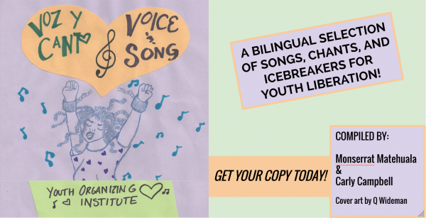 The Youth Organizing Institute has released a new Zine,”Voice and Song//Voz y Canto,” a bilingual compilation of songs, chants, and icebreakers for youth liberation! Can you make a donation or share to support this amazing work of youth taking on the School-To-Prison-Pipeline?