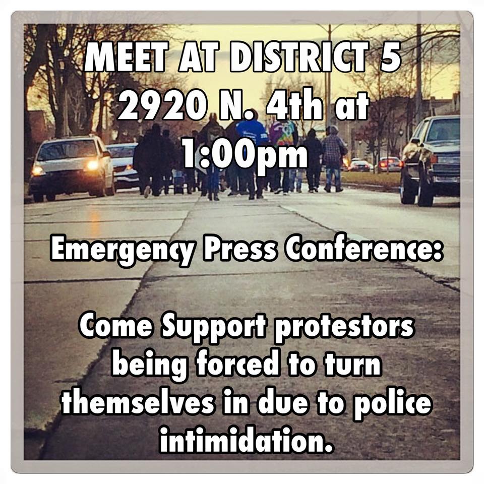 Categories Uncategorized Milwaukee: Police Issue Arrest Orders For Protest Organizers / Press Conference December 29 Post author By wibailoutpeople Post date December 29, 2014 ARTICLE: http://tinyurl.com/pa3t8j8 Share this: Share on X (Opens in new window) X Share on Facebook (Opens in new window) Facebook Like Loading... Related ← Coalition For Justice Joins Rainbow PUSH For Press Conference & March → Rev. Pinkney Defense Campaign Builds; Spouse Says They Remain Strong Despite Racist Imprisonment