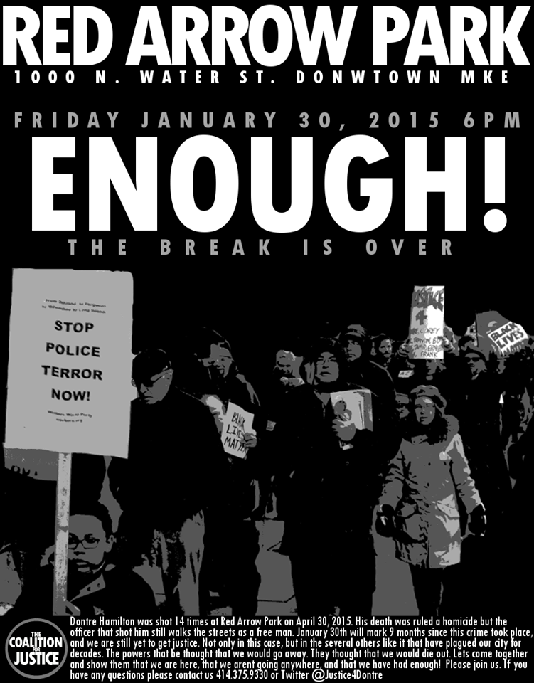 Dontre Hamilton was shot 14 times at Red Arrow Park on April 30, 2014. While his death was ruled a homicide, his killer (a former Milwaukee Poilce Officer) still walks the streets as a free man. This Friday (January 30) will mark 9 months since this crime took place, however we are yet to get justice for Dontre, and/or the other families that have seen their sons and loved ones taken from them at the hands of negligent police officers and racist vigilantes.