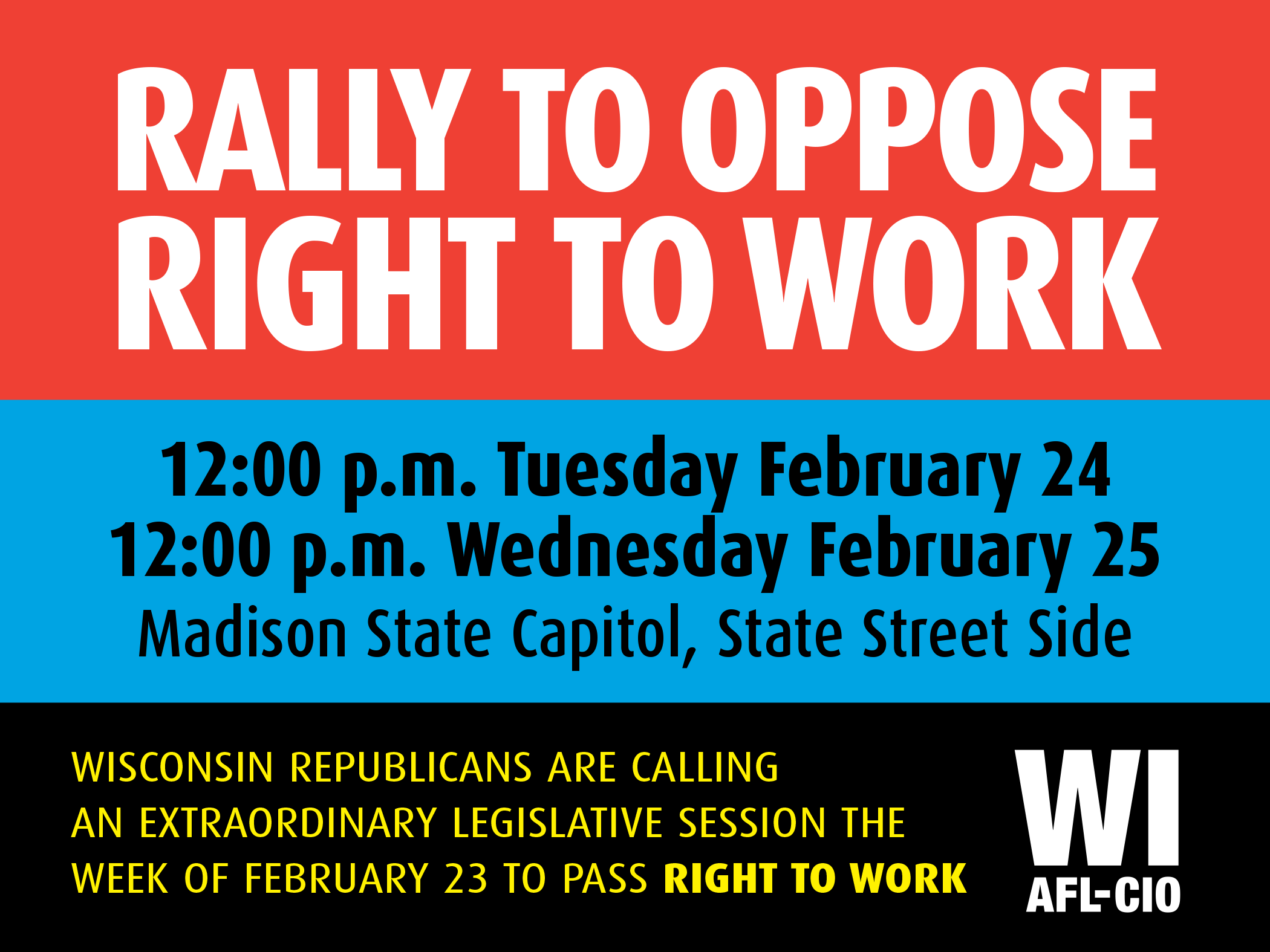 12 Noon rally, Wednesday, Feb, 25 at state capitol in Madison