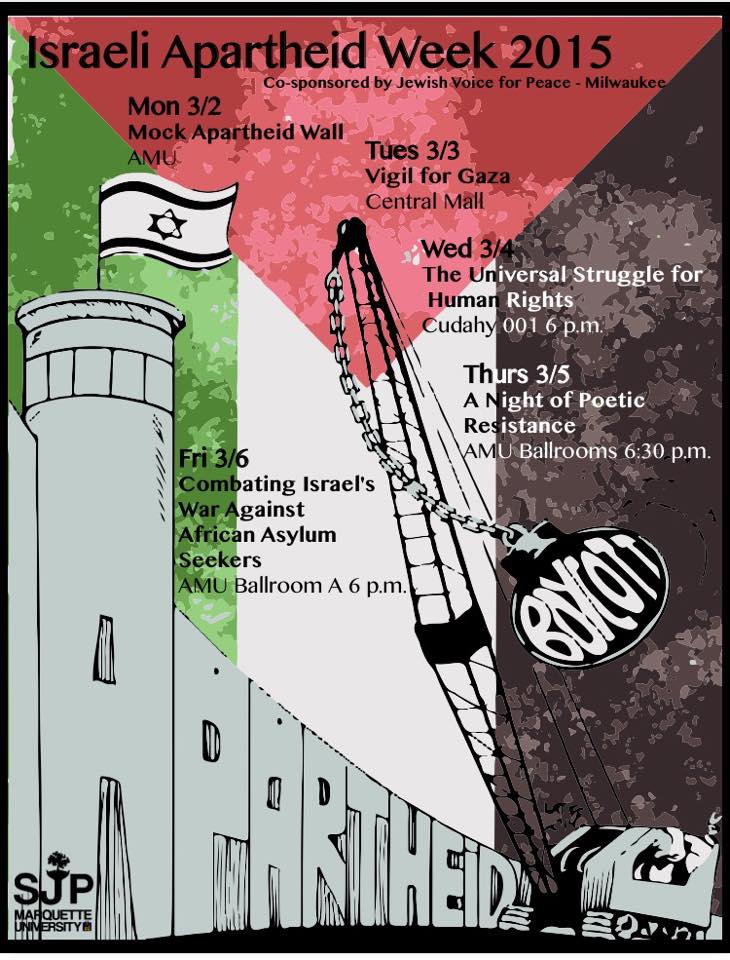 Israeli Apartheid Week at Marquette University is back this year March 2-6! Check out our flyers with a list of all of our awesome events we have planned for this year!