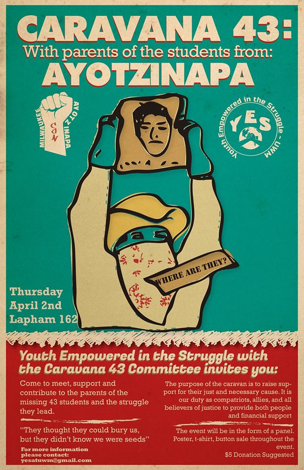 Varios padres de los 43 desaparecidos normalistas de Ayotzinapa, Guerrero, MX estan recorriendo 43 ciudades en los Estados Unidos. Ellos quieren informar a los estadounidenses sobre los acontecimientos en Ayotzinapa. Van a estar en la ciudad de Milwaukee por 3 dias y en el segundo de Abril ellos van a venir a nuestro campus en la Universidad de Milwaukee Wisconsin. Ven a escuchar sus historias y a aprender sobre los recientes tumultos en Mexico. Gratuito y abierto al publico. El evento se realizara en el edificio llamado Lapham numero 162. El salon 162 se ubica en la parte de atras del edificio Lapham si entra por la calle Maryland.