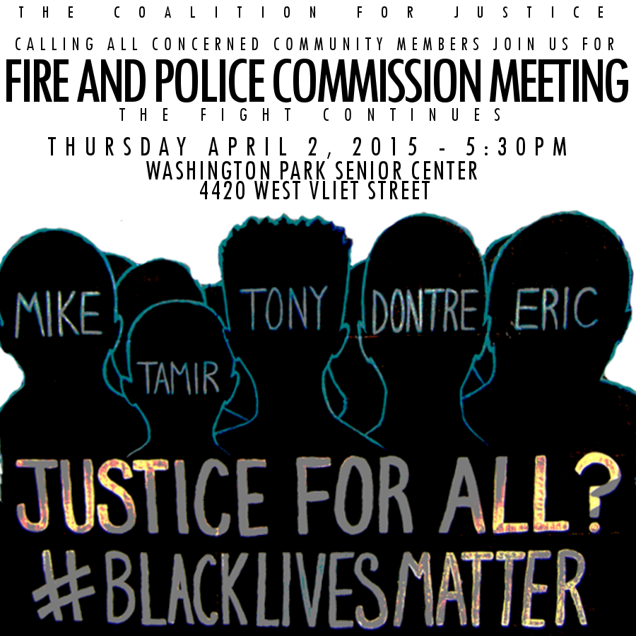 Categories Uncategorized Milwaukee, April 2: Coalition For Justice To Pack Fire & Police Commission Meeting Post author By wibailoutpeople Post date April 1, 2015 Share this: Click to share on X (Opens in new window) X Click to share on Facebook (Opens in new window) Facebook Like Loading... Related ← Mumia Needs You Now → Madison, April 3: Community Forum and Press conference: YGB response to the expected non-indictment of Matt Kenny