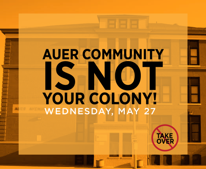 Auer Avenue Elementary is one of the public schools targeted by the Senator Alberta Darling (R – River Hills) and Representative Dale Kooyenga’s (R – Brookfield) Milwaukee Public Schools takeover plan and a symbol of all of our under-resourced schools. Join us as we surround Auer Ave. School and let state legislators and the county executive know that AUER Community is NOT your colony!