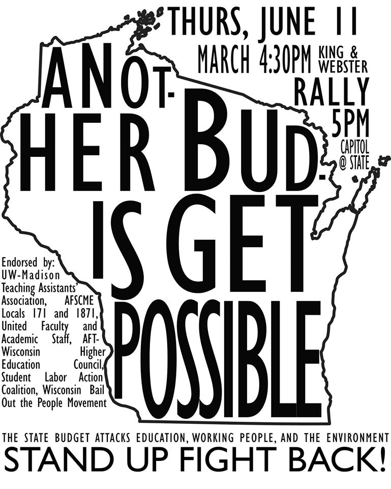All out for a mass rally at the Capitol the first day either house of the Legislature takes up the biennial state budget! We know this austerity budget forces unnecessary cuts on those who can least afford it–students, the elderly, those reliant on food stamps. It also targets scientists at the DNR who help protect our land and water, extension agents who help farmers and other rural landowners, and educators at all levels. We know that ANOTHER BUDGET IS POSSIBLE and this event will help launch a participatory process to create a budget that reflects the true priorities of the people of Wisconsin, rather than those of big business.
