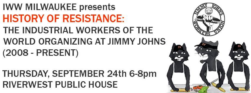 From 2008 to the present, workers at Jimmy Johns have organized against one of the most vehemently anti-union franchises from the inside, challenging their bosses and using collective, direct action to fight for better working conditions and collective power. Come out to the Public House (co-operative bar, 815 E. Locust, Milwaukee) on Thursday, September 24th, 6:00-7:30 PM) to hear about how this happened, and is still happening. You will be able to hear about the conversations between co-workers, agitation around shared grievances, building a workplace committee and marches on the boss that built up worker strength in the Twin Cities from 2008-2010. There will also be information on the union-busting efforts when the campaign went public, retaliation, organizing response, and the spread of IWW organizing to Jimmy Johns at other cities. The event will also explore the nature of Jimmy Johns’ business that breed such resistance, implications of the campaign, and the differences between this grassroots, direct-action organizing on the shop floor and contemporary fast food organizing in the “Fight for 15” efforts.