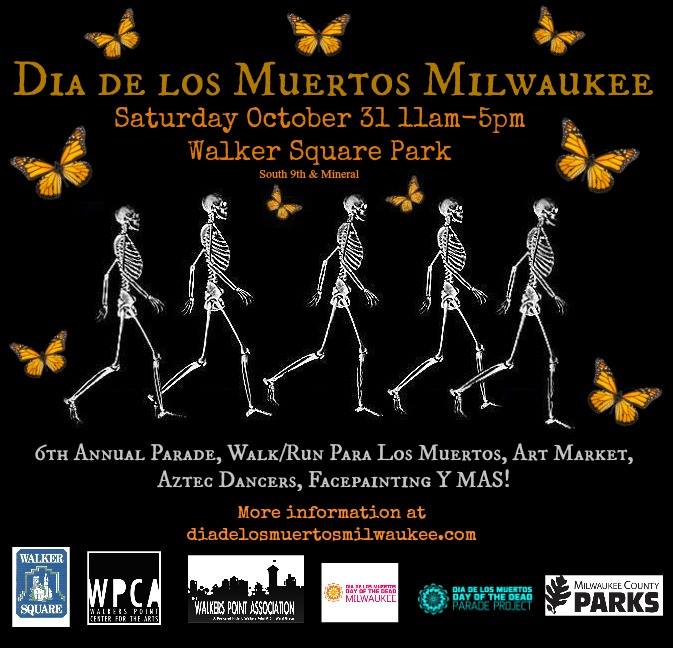 Milwaukee celebrates El Día de los Muertos with the 6th Annual Parade, 1st Annual Walk/Run para los Muertos, Art Market, Face-painting, Azteca Dancers , Community Ofrenda, Arte, Ceremonia, Communidad, Y Mas! Free to Everyone! Everyone welcome! Family Event brought to you by Walker’s Point Association, Walker Square Neighborhood Association, Viva la Piñata, family and friends all make this event possible each year. Donations are welcome! All donations go towards paying the permit fees and supporting artists who make this event beautiful with cultural depth and tradition!