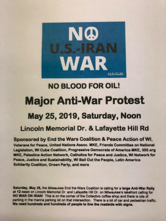 Categories Uncategorized No U.S. Sanctions or War on Iran! Milwaukee Stand For Peace May 25, 2019 Post author By wibailoutpeople Post date May 21, 2019 Share this: Click to share on X (Opens in new window) X Click to share on Facebook (Opens in new window) Facebook Like Loading... Related ← May 24, 2019: Climate Strike Protests in Madison and Milwaukee → We Demand The Budget Our Kids Deserve! Contact Members of the WI Joint Finance Committee