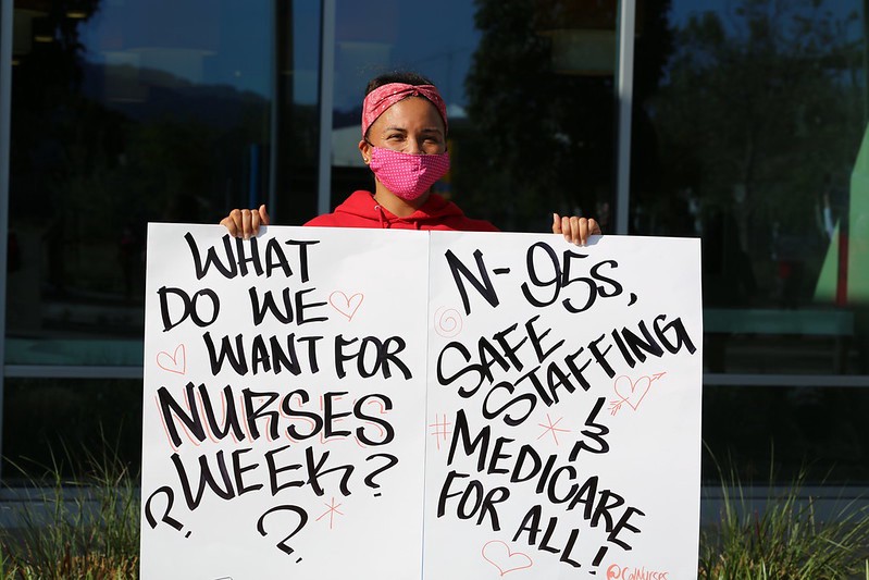 We want protections, not pizza! Sign from a shift change action at Oakland, California Kaiser.