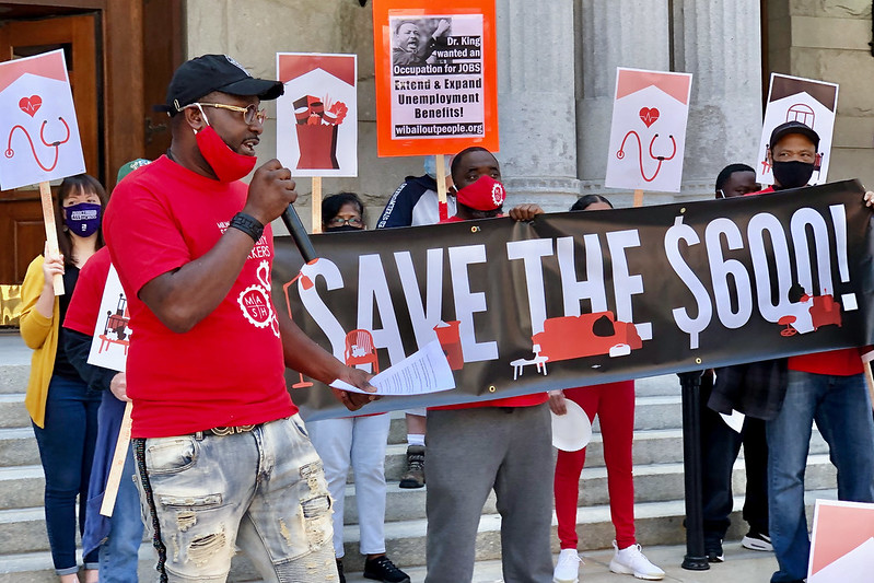Categories Uncategorized Milwaukee, October 3, 2020: March to Demand the Extension & Expansion of Unemployment Insurance Benefits Post author By wibailoutpeople Post date September 18, 2020 Milwaukee Area Service & Hospitality Workers Organization Photo: Wisconsin Bail Out The People Movement MASH protest at Ron Johnson’s office in Milwaukee September 17, 2020 / Photo: Susan Ruggles Share this: Click to share on X (Opens in new window) X Click to share on Facebook (Opens in new window) Facebook Like Loading... Related ← Black Lives Matter and Related Events in Wisconsin, September 18, 2020 and Beyond … → Madison, October 10, 2020: Black Lives Matter Marathon March
