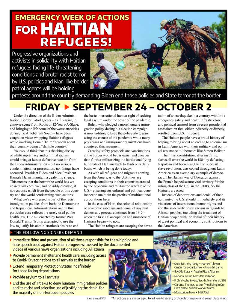 Who/What: Progressive organizations and activists in solidarity with Haitian refugees facing life-threatening conditions and brutal racist terror by U.S. policies and Klan-like border patrol agents will be holding protests around the country demanding the Biden Administration end those policies and State terror at the border.