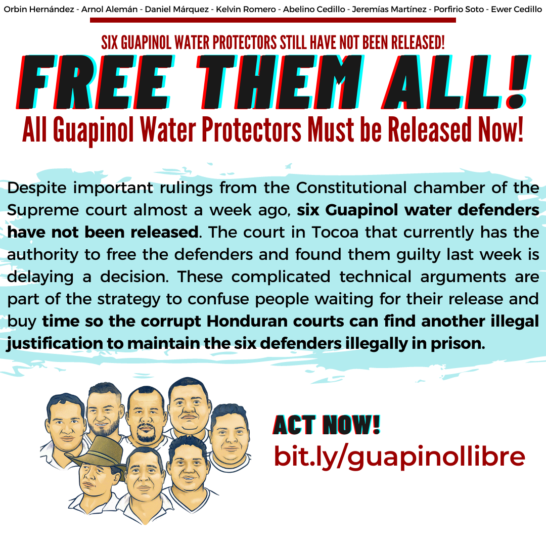 Despite important rulings from the Constitutional chamber of the Supreme court almost a week ago, six Guapinol water defenders have not been released. The court in Tocoa that currently has the authority to release the defenders and found them guilty last week is delaying a decision. The court argues that the Appeals court in La Ceiba must make a new decision about their pre-trial detention since the Appeals court decision was subject to the Constitutional chamber’s ruling. In short, these complicated technical arguments are part of the strategy to confuse people waiting for their release. This is a strategy to buy time so that the corrupt Honduran courts can find another illegal justification to maintain the six defenders illegally in prison.