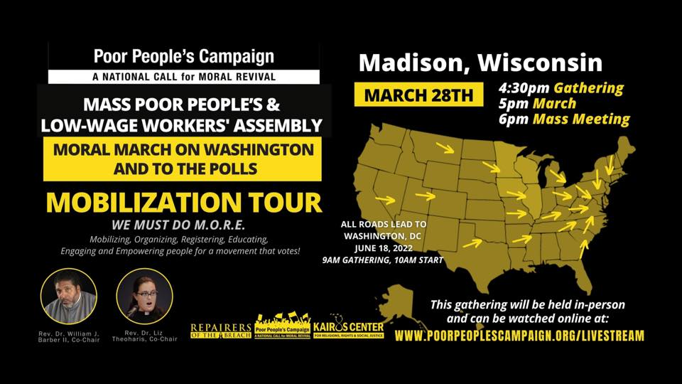 - 6:00 pm – Rev. Liz Theoharis will be the keynote speaker at First United Methodist Church (203 Wisconsin Ave). If you are able to car-caravan from your part of Wisconsin to join us in Madison on March 28th, please let Tim know by calling 608-630-3633. Here is the facebook event for more info: https://www.facebook.com/events/645232076783036?
