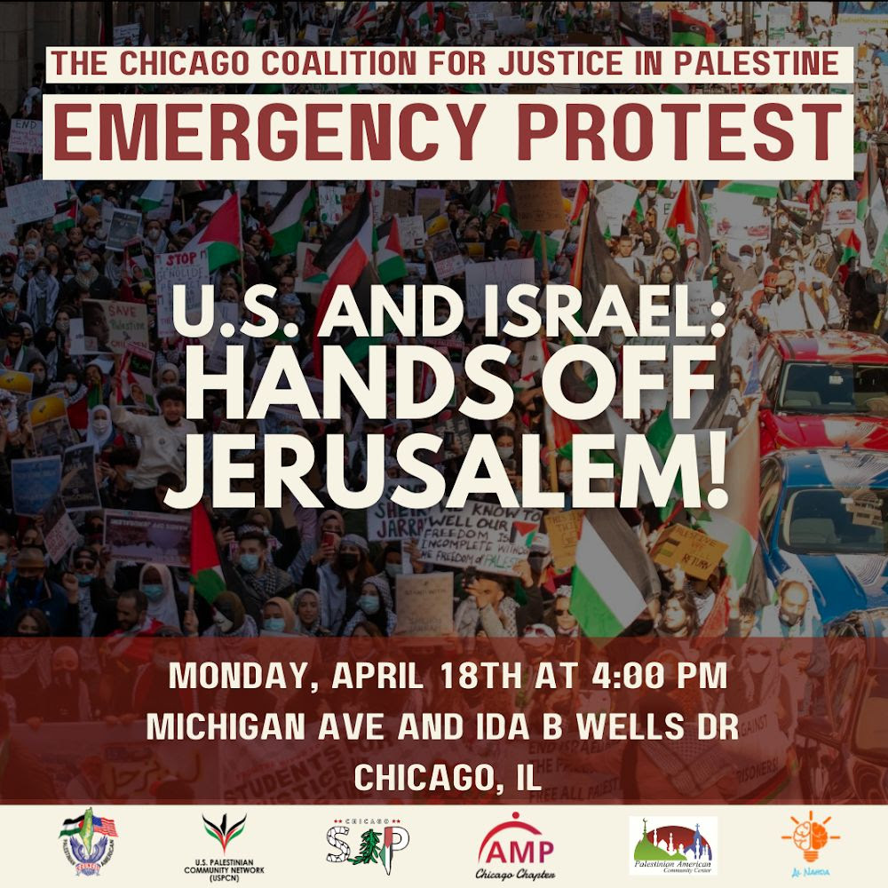 In response, Chicago Coalition for Justice in Palestine is calling for a rally this Monday, April 18th at Michigan Ave & Ida B. Wells Drive, at 4 PM, to say U.S. and ISRAEL: #HandsOffJerusalem!