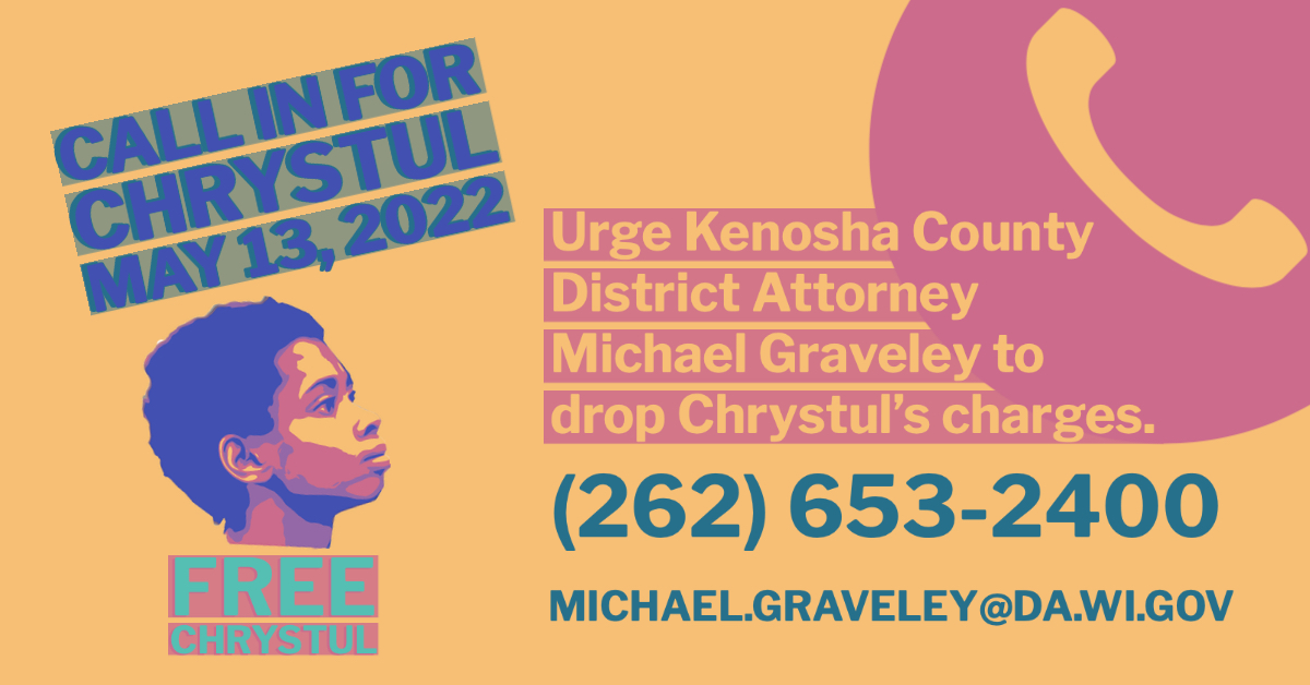 Categories Uncategorized Free Chrystul Kizer – Call Kenosha D.A. to Demand the Dropping of all Charges! Post author By wibailoutpeople Post date May 10, 2022 Free Chrystul Kizer Hey folks, please boost! Chrystul has a pre-trial hearing Friday, May 13th. This week, let’s flood Kenosha DA Michael Graveley with calls to drop all charges against Chrystul! (262) 653-2400 Michael.Graveley@da.wi.gov Share this: Click to share on X (Opens in new window) X Click to share on Facebook (Opens in new window) Facebook Like Loading... Related ← Temple Association of University Professionals – Statement on Abortion Rights and the Supreme Court → Milwaukee, WI May 14, 2022: Protest for Abortion Rights! Fight for Reproductive Freedom! We Won’t Go Back!