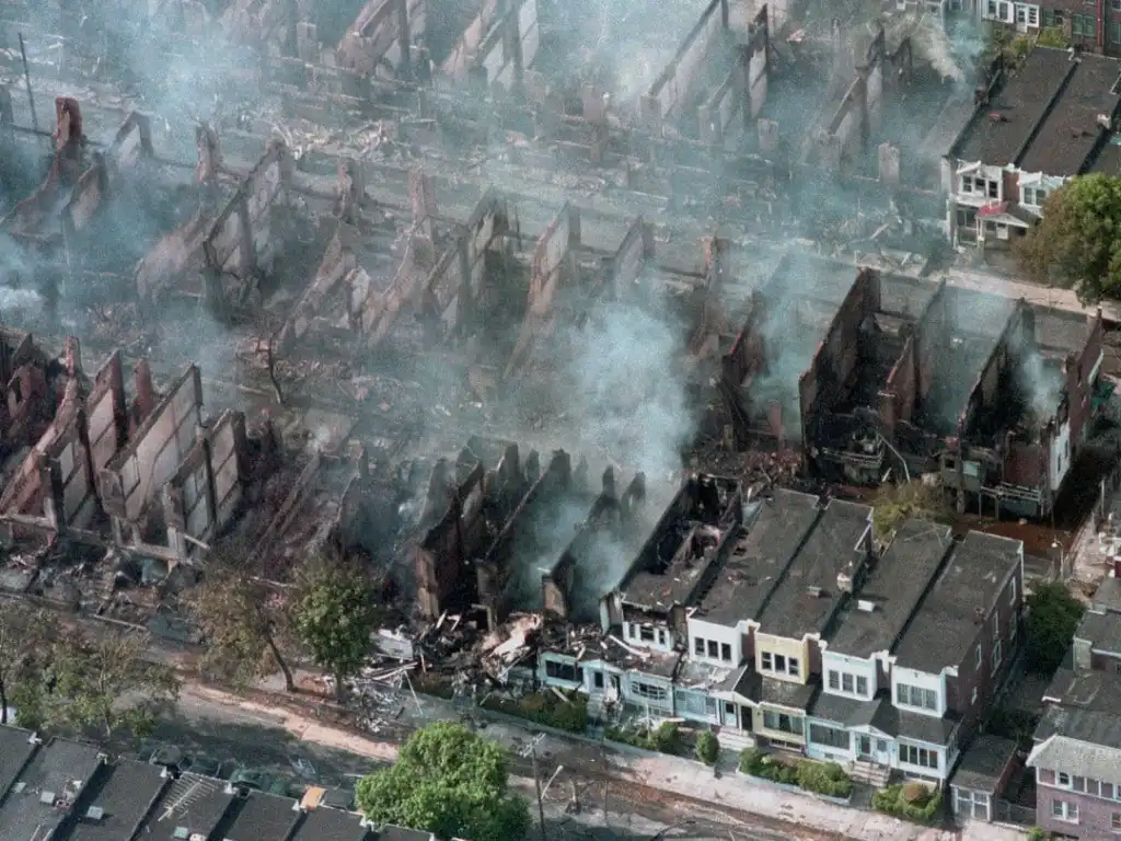 Philadelphia police, with assistance from the Pentagon and FBI, had dropped a bomb from a helicopter on the home.