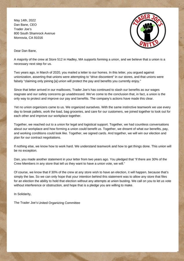 Categories Uncategorized Workers at Hadley, Mass Trader Joe’s Form Union Post author By wibailoutpeople Post date May 23, 2022 https://traderjoesunited.org/ https://www.instagram.com/traderjoesunited/ Tweets by TraderJoesUnite Share this: Click to share on X (Opens in new window) X Click to share on Facebook (Opens in new window) Facebook Like Loading... Related ← Starbucks Workers On the Move Nationwide! Workers at Over 80 Stores Vote to Unionize → Nine-month battle yields contract for Howard healthcare workers
