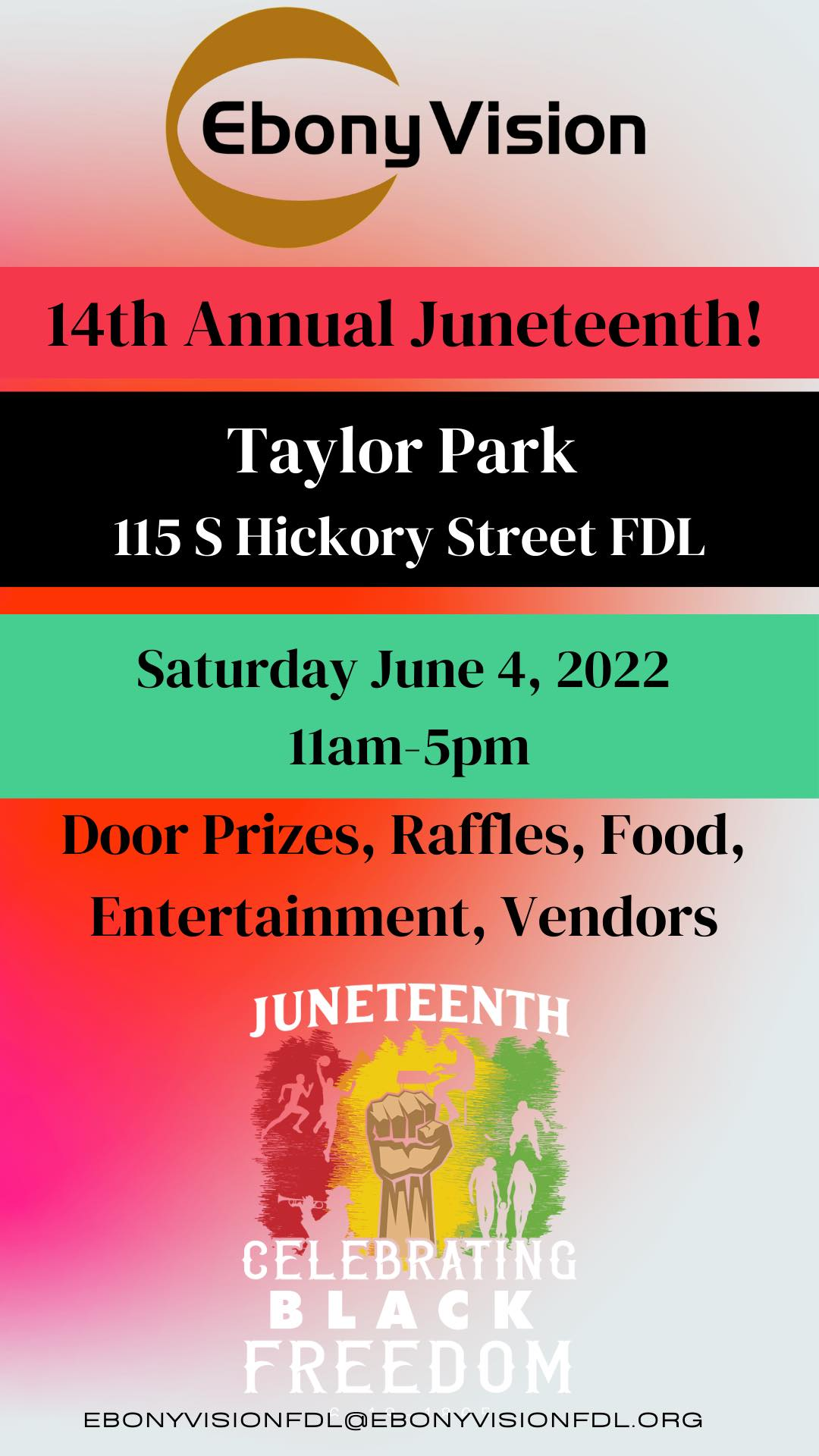 Categories Uncategorized Fond du Lac, June 4, 2022: 14th Annual Juneteenth Post author By wibailoutpeople Post date May 29, 2022 EBONY VISION Share this: Click to share on X (Opens in new window) X Click to share on Facebook (Opens in new window) Facebook Like Loading... Related ← Letter on the Uvalde, Texas Massacre → Global Afrikan Congress on the Summit of the Americas