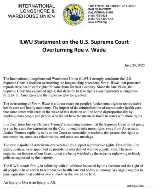 Categories Uncategorized ILWU Union Statement on the U.S. Supreme Court Overturning Roe v. Wade Post author By wibailoutpeople Post date June 25, 2022 International Longshore and Warehouse Union – ILWU Share this: Click to share on X (Opens in new window) X Click to share on Facebook (Opens in new window) Facebook Like Loading... Related ← ‘We Won’t Go Back!’: Rapid-Response Protests Across US After Roe Reversal → Milwaukee, June 26, 2022: Milwaukee Car & Bike Caravan to Lift the Cuba Blockade