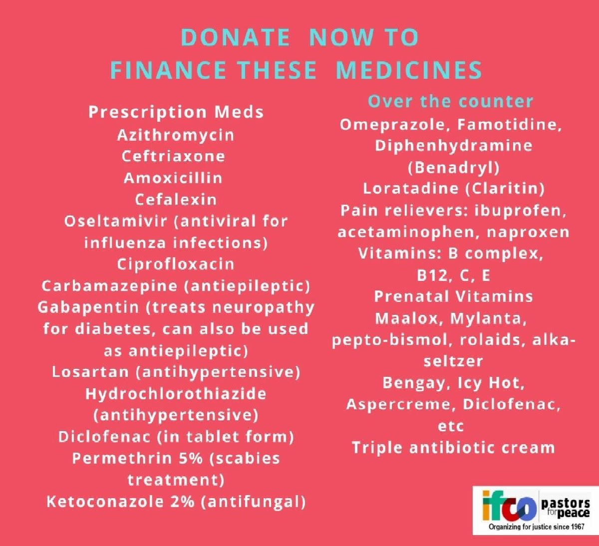 Donate by credit card (be sure to note your gift is for Medical Aid) or mail a check to IFCO at P.O.Box 1368, Orange, NJ 07051-1368. Write medical aid in the memo line. All donations are tax deductible