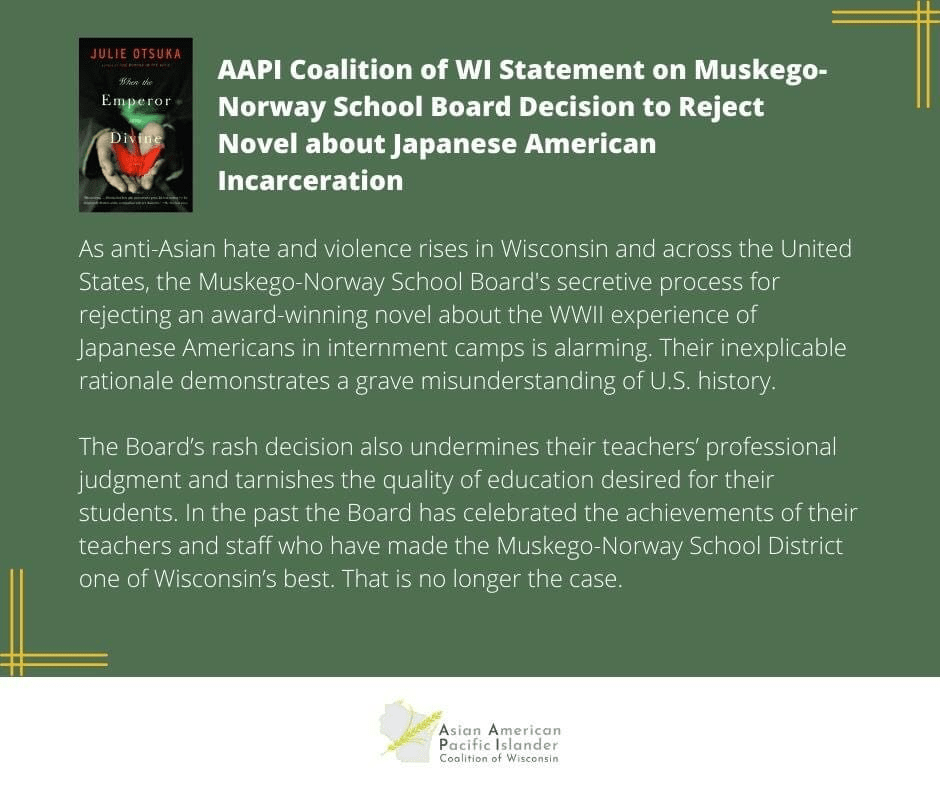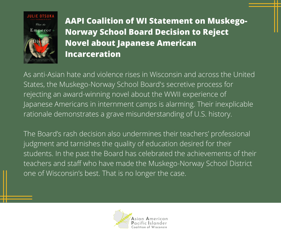Other Wisconsin School Boards will look to this decision as a model; Wisconsin residents and the AAPI community must not stay silent when attempts are made to erase our history. We must stand in solidarity with our black and brown communities to prevent our histories from being denied. Education is one of our best tools to fight racism and achieve collective liberation. Our history is American history.