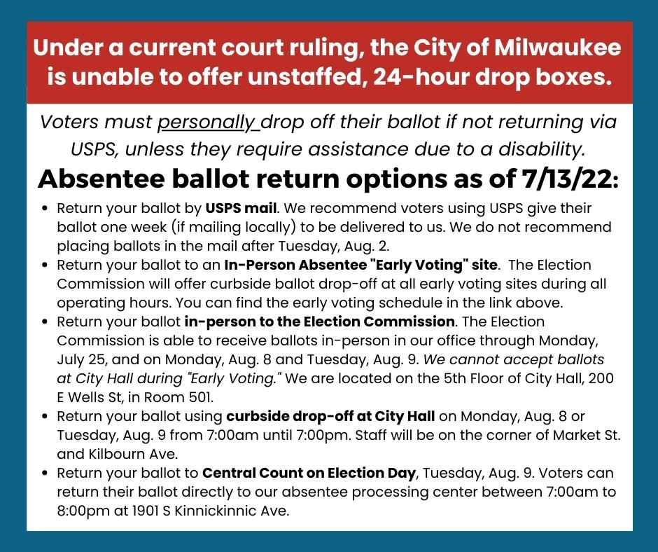 Categories Uncategorized City of Milwaukee: Absentee Ballot Return Options as of 7/13/22 Post author By wibailoutpeople Post date July 14, 2022 There are still FIVE ways to return your absentee ballot, even though drop boxes are no longer allowed.For early voting hours with curbside drop-off, click this link: https://city.milwaukee.gov/…/ElectionInfor…/Early-Voting Share this: Share on X (Opens in new window) X Share on Facebook (Opens in new window) Facebook Like Loading... Related ← Watertown, WI July 30: PRIDE In The Park → Milwaukee, July 15, 2022: Expose the Fake Clinics Picket! All Out for Abortion Rights!