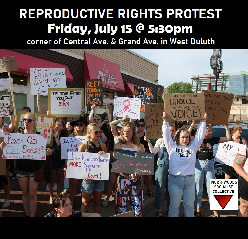 Join us for a rally in support of reproductive rights. We’ll be on the corner of Central Avenue and Grand Avenue in West Duluth. There is parking and bathrooms at the adjacent Memorial Park. If you can, bring your own sign!