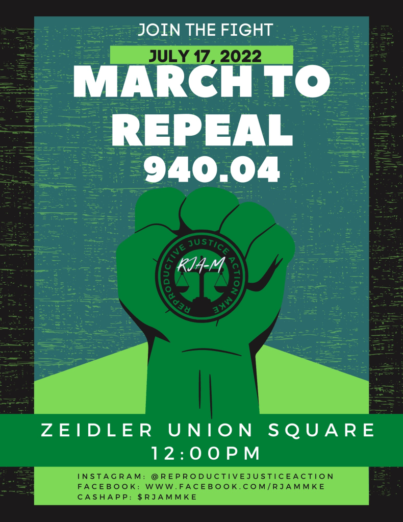 Categories Uncategorized Milwaukee, July 17, 2022: March to Repeal 940,04 – Reproductive Justice NOW! Post author By wibailoutpeople Post date July 14, 2022 Event: https://fb.me/e/3ckzzbjY2 Share this: Share on X (Opens in new window) X Share on Facebook (Opens in new window) Facebook Like Loading... Related ← Mumia Abu Jamal Commentaries: Jayland Walker, Fight for Reproductive Justice and More! → Hazel Dickens: They’ll Never Keep Us Down