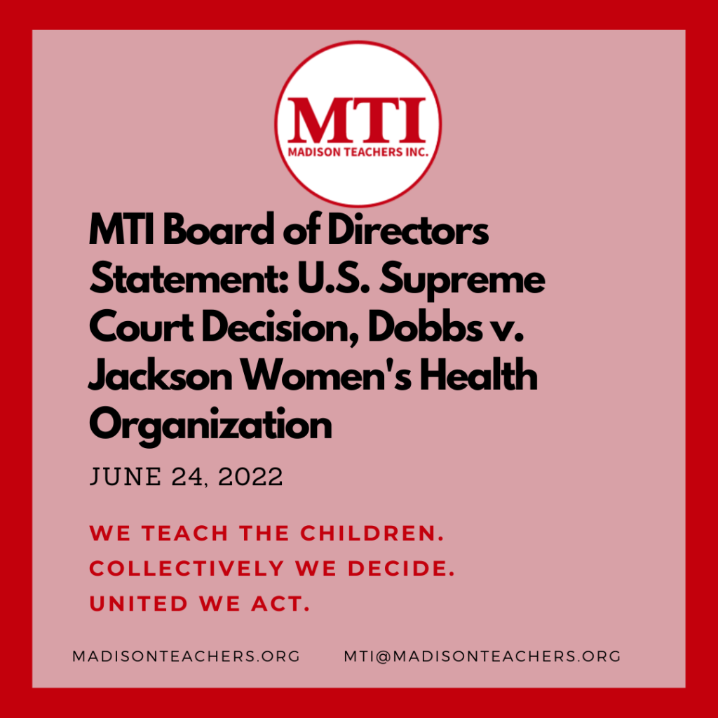 Madison Teachers Inc.’s Board of Directors decries this decision not just for rolling back people’s rights to our state’s 1849 abortion ban, but for opening the door to an erosion of rights far beyond personal health care decisions.