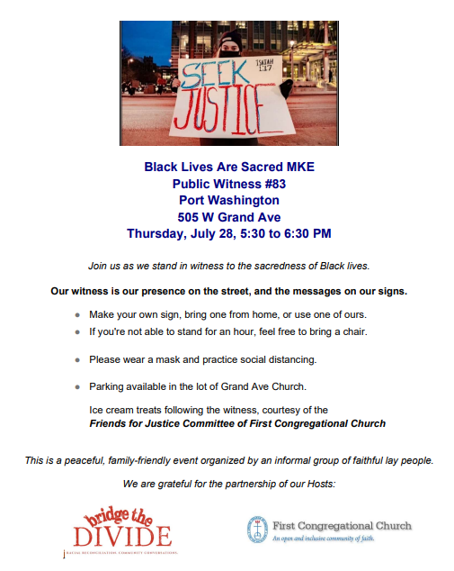Our eighty-third public witness in support of racial justice and the dignity of the human person is hosted by Bridge the Divide and the Friends of Justice Committee of First Congregational Church of Port Washington.