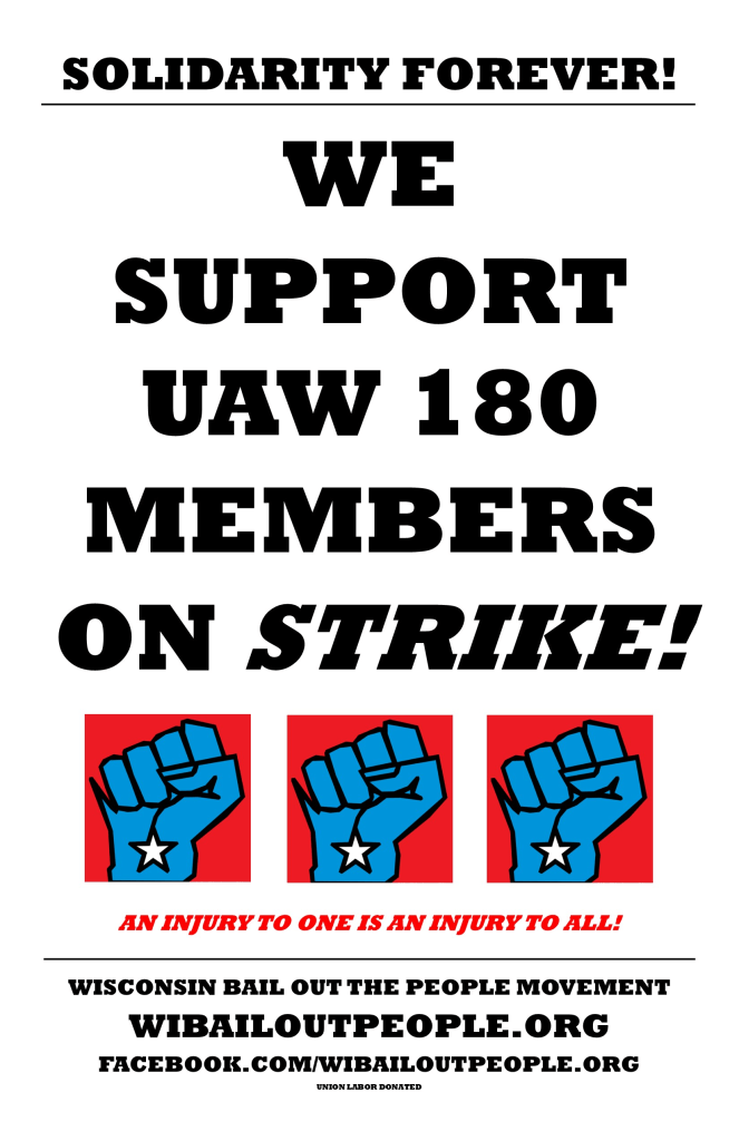 Categories Uncategorized Racine, WI: WE SUPPORT UAW 180 MEMBERS ON STRIKE! – SOLIDARITY FOREVER! Post author By wibailoutpeople Post date July 24, 2022 https://wibailoutpeople.org/ UAW Local 180 Share this: Click to share on X (Opens in new window) X Click to share on Facebook (Opens in new window) Facebook Like Loading... Related ← July 28, 2022: Black Lives Are Sacred MKE Public Witness 83 – Port Washington, WI → 2,500 St. Louis Machinists Union Members to Strike Boeing Aug. 1, 2022