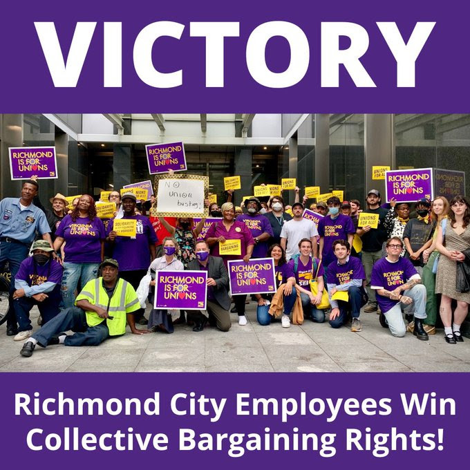 Richmond City workers won historic collective bargaining rights when the Richmond City Council voted to approve a collective bargaining ordinance Monday night. “Tonight we celebrate,” tweeted SEIU Virginia 512. “Tomorrow we continue to organize to win good union jobs and quality public services for all Richmond families!” SEIU organizing committee member Ben Himmelfarb told VPM/NPR that “The organizing that’s been done stands on the shoulders of people who have been here for decades, including people who have tried to organize in the past for better working conditions and better public services.”
