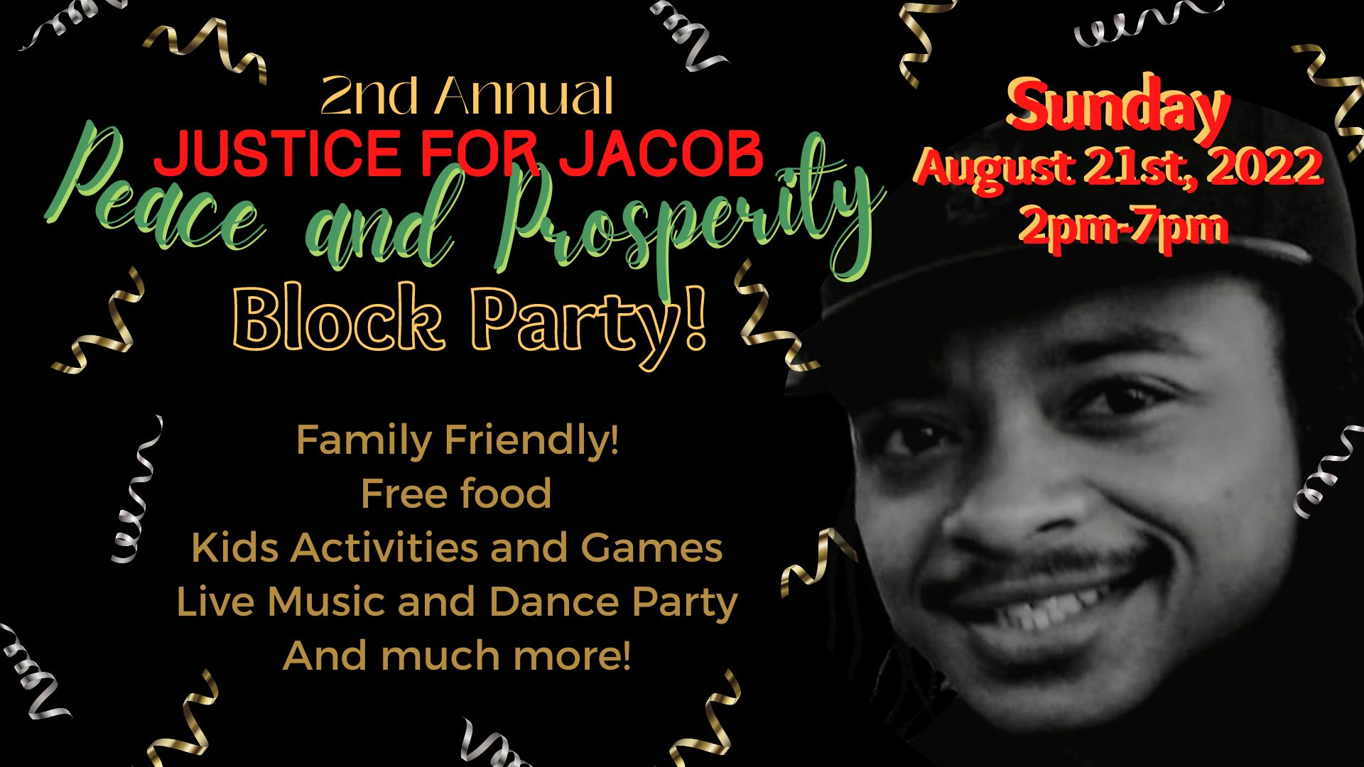 The Justice for Jacob Block Party is a family friendly event to uplift and support the community by coming together to encourage peace and prosperity for all. This event will consist of family fun for all ages, free food, dance party, games and live music!