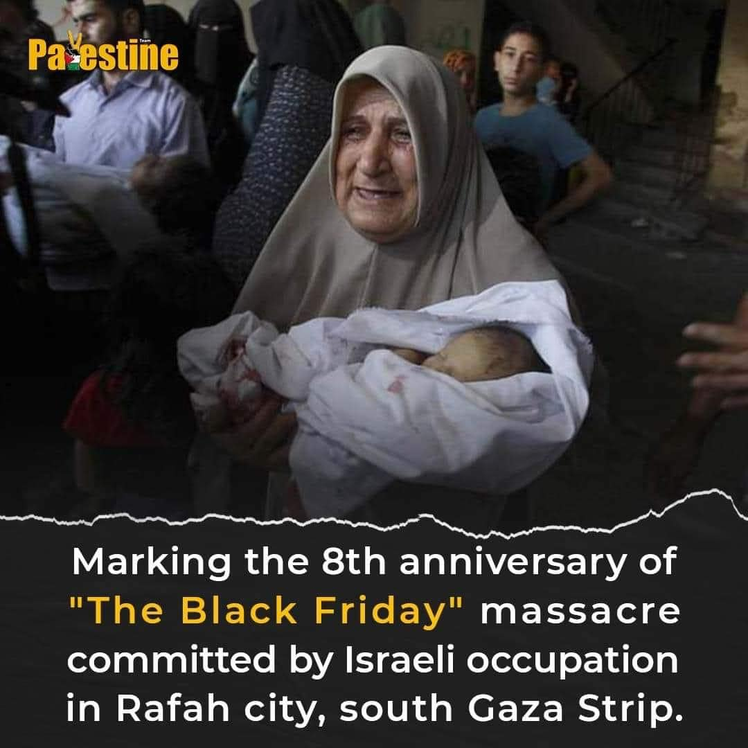 Categories Uncategorized “The Black Friday” Massacre in Palestine Post author By wibailoutpeople Post date August 3, 2022 Azooz Nb : Today marks the eighth anniversary of “The Black Friday” massacre committed by Israeli occupation forces in Rafah city, south of Gaza, killing more than 140 Palestinians within hours, including 75 c Share this: Click to share on X (Opens in new window) X Click to share on Facebook (Opens in new window) Facebook Like Loading... Related ← Free Rides to Go Vote from Souls to the Polls WI → Condemn FBI Raids on African People’s Socialist Party and Uhuru Movement!
