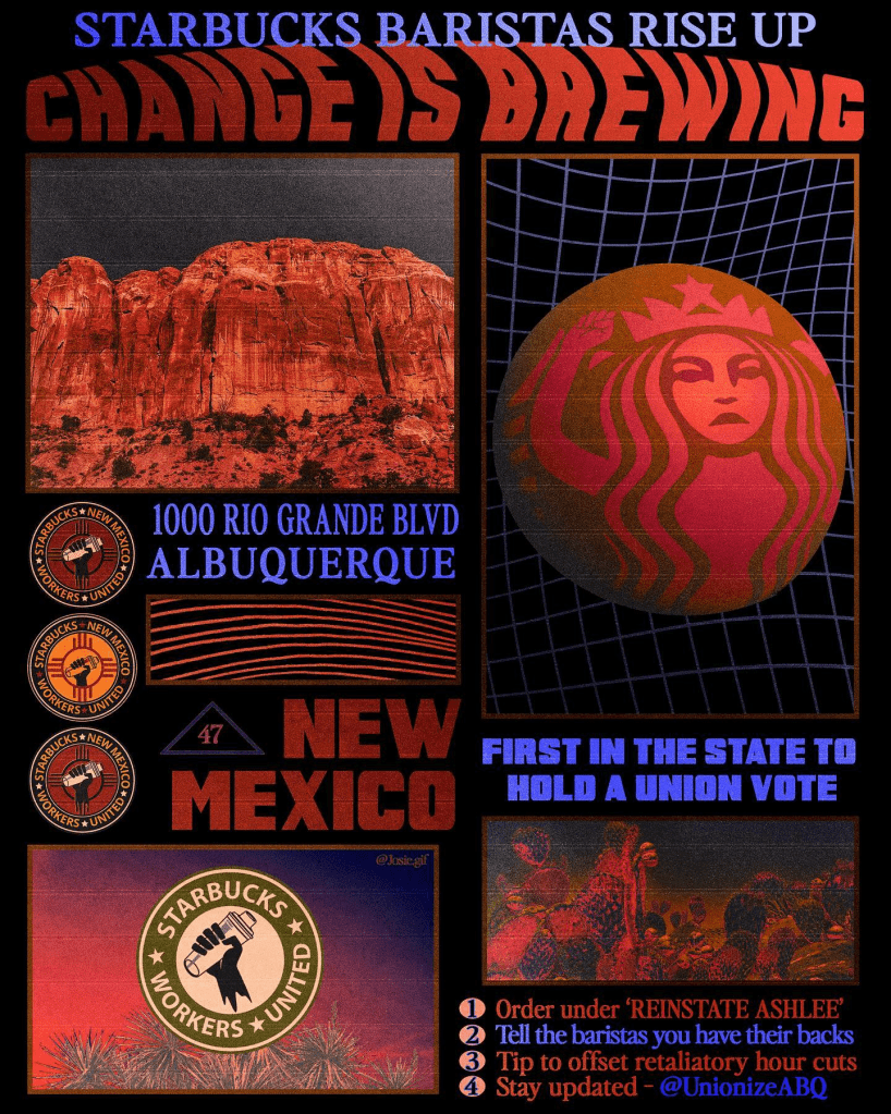 Starbucks workers in Albuquerque need your support! With election ballots being mailed out on August 22nd, the first unionizing Starbucks in New Mexico is being subjected to constant union-busting, including the firing of 9-year pro-union partner Ashlee Southern. Stop by the I-40 & Rio Grande store, order under the name “REINSTATE ASHLEE,” and make sure management knows they won’t get away with another unjust firing!! ![]()