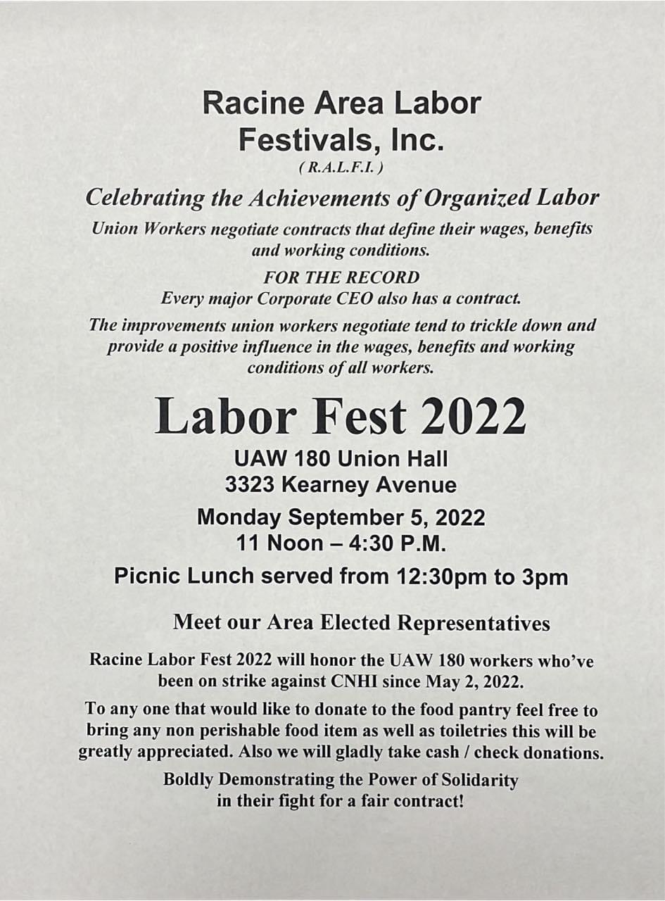 Categories Uncategorized Racine Labor Fest September 5, 2022 – Support Members of UAW Local 180 Still on Strike! Post author By wibailoutpeople Post date August 15, 2022 UAW Local 180 Share this: Click to share on X (Opens in new window) X Click to share on Facebook (Opens in new window) Facebook Like Loading... Related ← Support Starbucks Workers in Albuquerque! → August 19, 2022: Building Unity’s Lacrosse Tour Stop #1 – St. Rose of Viterbo Convent