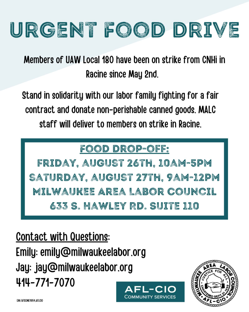 Categories Uncategorized August 26-27, 2022: Urgent Food Drive for Members of UAW Local 180 on Strike Against CNHi in Racine, WI Post author By wibailoutpeople Post date August 16, 2022 Milwaukee Area Labor Council Share this: Click to share on X (Opens in new window) X Click to share on Facebook (Opens in new window) Facebook Like Loading... Related ← 2022 Garveyfest Promo Podcast #3 → Letter to Biden: Reverse Trump’s harmful Cuba policies!
