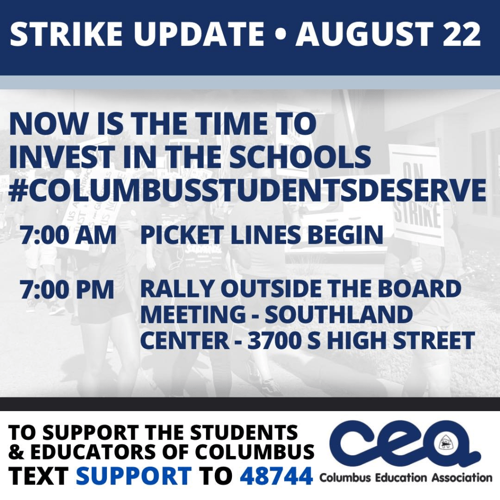 CCS Strike Update: The Columbus City School Board will meet tonight August 22, 2022, at 8pm at Southland Center (3700 s high street). CEA hopes our supporters will join us as CEA rallies, beginning at 7pm! Parking is available in the Park and Ride lot located at 3773 S. High Street.