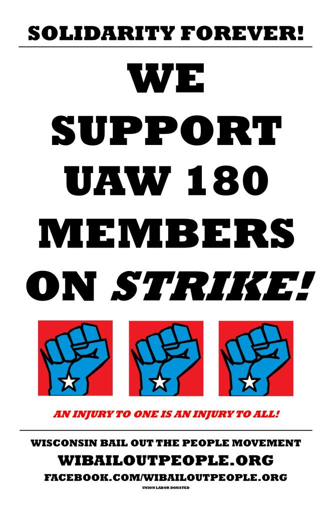 Categories Uncategorized Racine: UAW Local 180 Members Still on Strike, Need Support Post author By wibailoutpeople Post date August 23, 2022 UAW Local 180 Picket line support needed and drop off gift cards, food, water etc. at the union hall: 3323 Kearney Avenue, Racine, WI. Questions?: (262) 631-5980 Share this: Click to share on X (Opens in new window) X Click to share on Facebook (Opens in new window) Facebook Like Loading... Related ← Youth Volunteers Needed for Milwaukee LaborFest 2022 → Fond du Lac, September 10, 2022: Pro Choice- Human Rights Rally Fond du Lac, WI