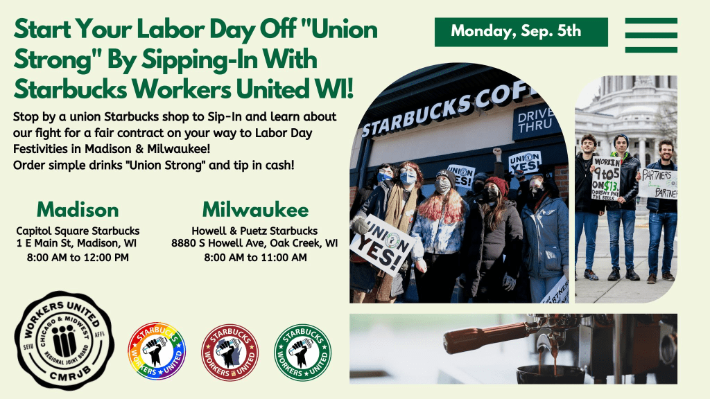 Categories Uncategorized Support Starbucks Workers In Wisconsin Post author By wibailoutpeople Post date September 5, 2022 South Central Federation of Labor SBWorkersUnited Share this: Share on X (Opens in new window) X Share on Facebook (Opens in new window) Facebook Like Loading... Related ← Thousands March in Milwaukee’s Labor Day Parade → Workers At Starbucks Hosted “Sip-Ins” At Over 110 Stores On Labor Day 2022