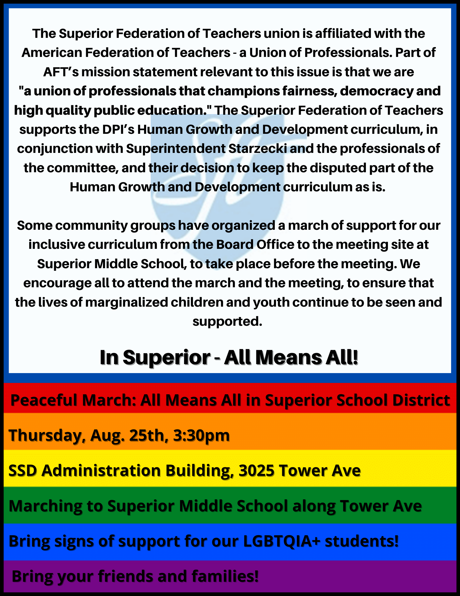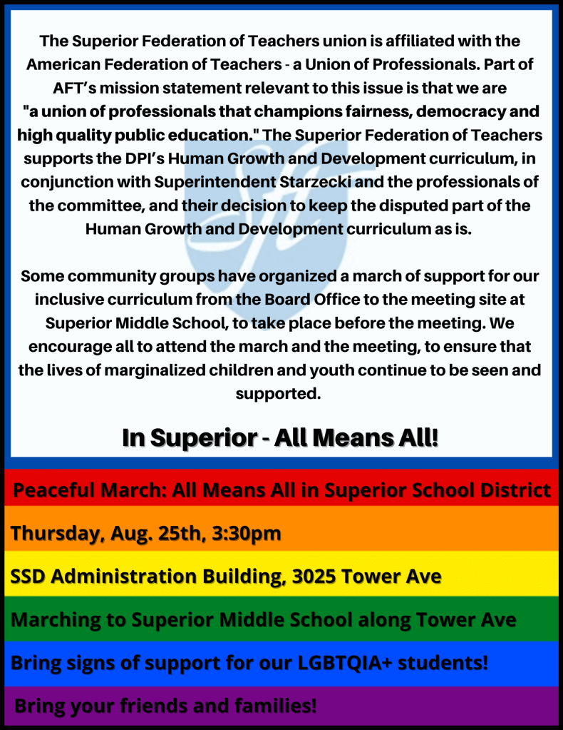 Categories Uncategorized Union-Community Support For LGBTQIA Students In Superior, WI Post author By wibailoutpeople Post date September 11, 2022 AFT-Wisconsin August 25, 2022, Superior, WI – AFT-Wisconsin Share this: Share on X (Opens in new window) X Share on Facebook (Opens in new window) Facebook Like Loading... Related ← Nina Simone – Revolution → Building Unity’s Democracy Tour Comes to Beloit, September 12, 2022